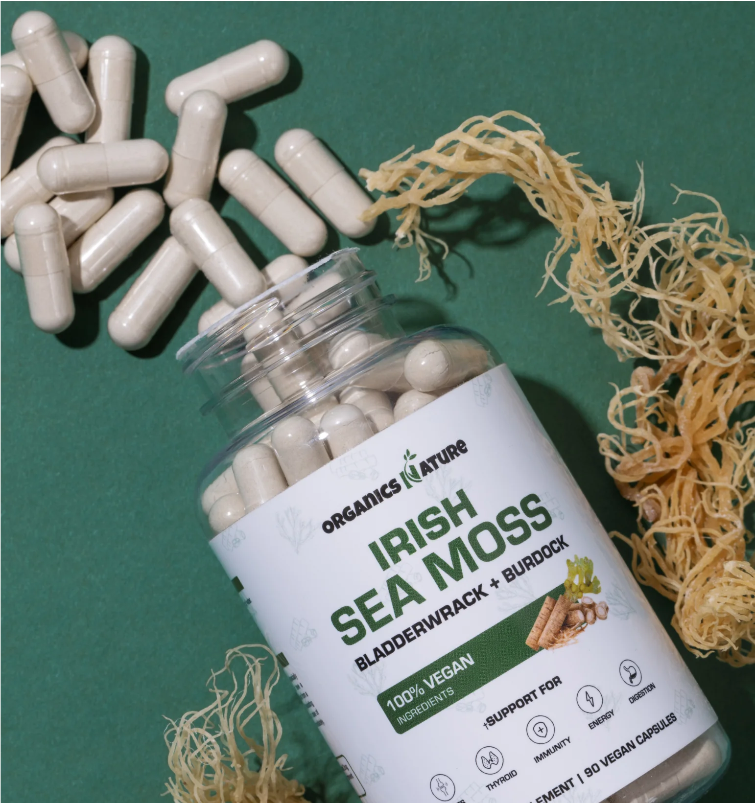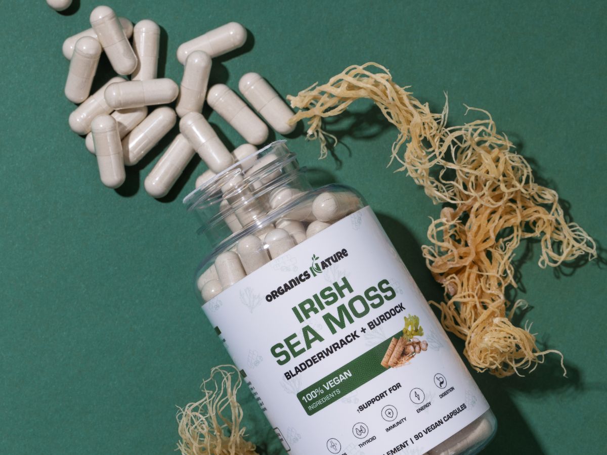 1000MG of Organic Irish Sea Moss, containing over 90 vitamins and minerals that supports gut health, heart & nerve health, immune system, maintaining healthy blood pressure, and thyroid health, as well as respiratory comfort.